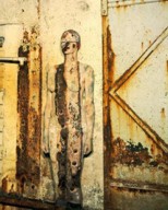 Woman in front of front of corroded hanger