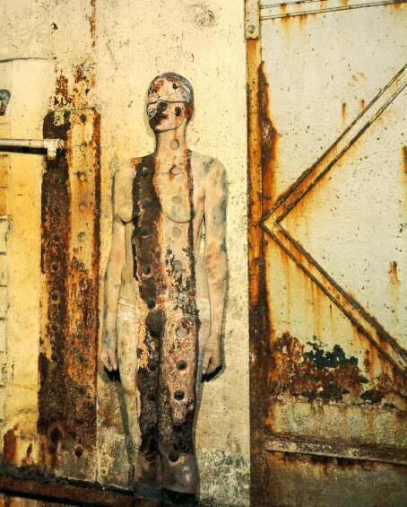 Can you distinguish the human flesh from the corroded steel?