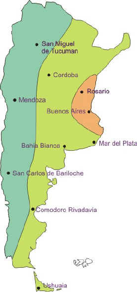 The following map of the atmospheric corrosivity measured in Argentina was adapted from "Atmospheric Corrosion of Copper in Ibero-America" by M. Morcillo, E. Almeida, M. Marrocos, and B. Rosales, Corrosion, Vol. 57, No. 11, pages 967-980.