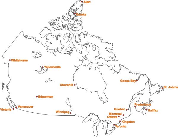 The Corrosion Doctors site contains many references to specific locations on this map of Canada. Move your mouse around to see these links.