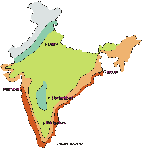 Corrosion in IndiaThe map describing corrosion patterns in India shows macroscopic differences between areas, with coastal regions being the most severe. The corrosion map of India was prepared by the Corrosion Advisory Bureau, Metals Research Committee (Council of Scientific & industrial Research) Jamshedpur and the book was edited by K.N.P.Rao and A.K.Lahiri. The map was drawn on the basis of data collected over the 5 year period from 1963 to 1968 and published in 1970. The published booklet can be purchased by contacting the Director, National Metallurgical Laboratory, Jamshedpur-831 007. (The Map of India makes the News)