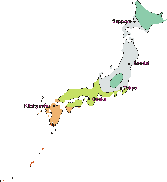 This map of the corrosion severity observed in various regions of Japan shows an increasing corrosivity from North to South. It was adapted from "Q & A on Corrosion & Protection for metals- Corrosion police" edited by Fushoku, Boushoku, Gijutsu, and Kyoukai of the Japanese Society of Corrosion and Protection (Maruzen Co., 1988).