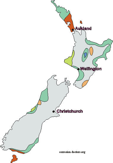 The following map shows how much corrosion vary greatly in New Zealand. Macroscopic differences exist between areas, with coastal regions being the most severe. Adapted from "Corrosivity Mapping - A Sensitive and Cost effective Means of Characterizing a Region's Levels of Atmospheric Corrosion" by G.A. King, paper 638, CORROSION 93, NACE International, Houston, TX, 1993.