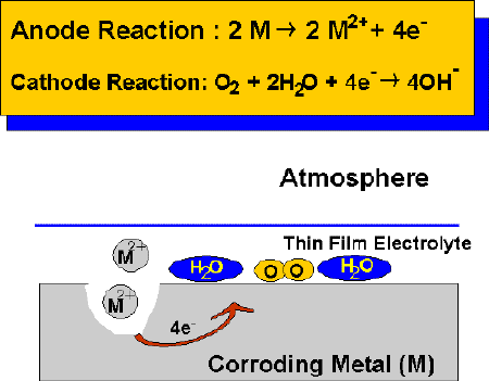 In the presence of thin film electrolytes, atmospheric corrosion proceeds by balancing anodic and cathodic reactions. The anodic oxidation reaction involves the dissolution of the metal in the electrolyte, while the cathodic reaction is often assumed to be the oxygen reduction reaction. Oxygen from the atmosphere is readily supplied to the electrolyte, under thin film corrosion conditions. The thickness and electrical conductivity of the film will greatly depend on relative humidity, the nature of the surface contaminants, and many other factors such as temperature, sunlight exposure etc. Some surface contaminants can be very hygroscopic, which means they will reduce the level of humidity causing the formation of a film of electrolyte and greatly increase the duration of wetness on a corroding surface.