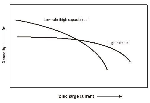 Some cell formats, such as bobbin cells, are better suited for low rates of discharge, whereas others, such as spirally wound, are ed for more rapid discharge. The following figure shows the different effects of the magnitude of discharge current upon capacity (in ampere hours) for cells designed to have high and low rates of discharge.