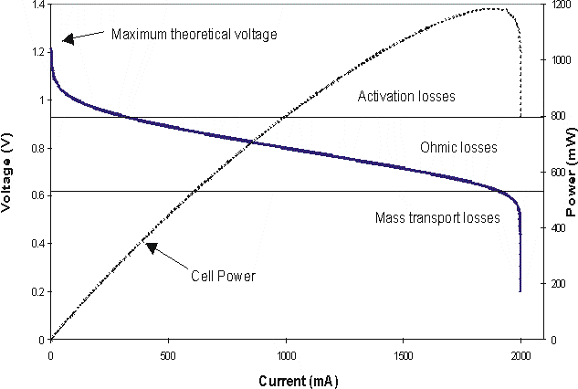 When current is drawn from a cell, the cell voltage falls due to polarization. The higher the current, the greater the voltage drop.