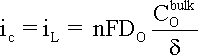 The following Figure illustrates the concentration-distance profile at the electrode surface approximated by a simple gradient. In this diagram the metallic surface is positioned at the ordinate axis while the x-axis expresses the distance away from the electrode and the y-axis the concentration of the chemical species being reacted.