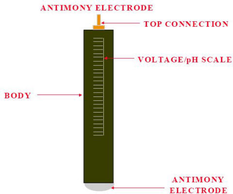 Antimony is a unique metal with the characteristic of a direct relationship between pH and its measured potential. The potential difference or voltage developed between antimony and a copper/copper sulfate reference electrode varies between approximately 0.1 volts to 0.7 volts due to variations in the pH. (reference)