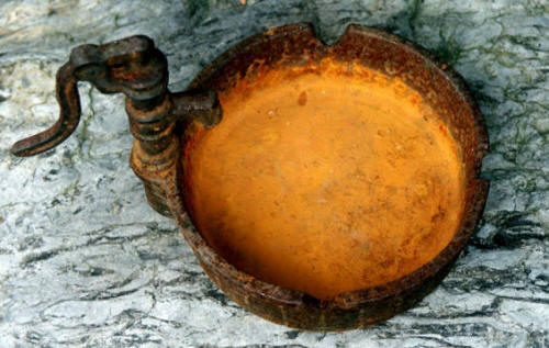 | Why Metals Corrode?This is a very good question indeed!Corrosion is the disintegration of metal through an unintentional chemical or electrochemical action, starting at its surface. All metals exhibit a tendency to be oxidized, some more easily than others. A tabulation of the relative strength of this tendency is called the galvanic series. Knowledge of a metal's location in the series is an important piece of information to have in making decisions about its potential usefulness for structural and other applications. The driving force that causes metals to corrode is a natural consequence of their temporary existence in metallic form. To reach this metallic state from their occurrence in nature in the form of various chemical compounds (ores), it is necessary for them to absorb and store up for later return by corrosion, the energy required to release the metals from their original compounds. The following pictures illustrate the similarity in color between pale green malachite, a common copper ore mineral, and the corrosion products on a brass plate (70% copper) exposed to a humid environment. Malachite, a common copper ore mineral Corroded brass plate The thermodynamic or chemical energy stored in a metal or that is freed by its corrosion varies from metal to metal. It is relatively high for metals such as magnesium, aluminum, and iron, and relatively low for metals such as copper, silver and gold. the following Table lists a few metals in order of diminishing amounts of energy required to convert them from their oxides to metal. (reference) The high reactivity of magnesium and aluminum expressed as energy in Table 2.1 is paralleled by the special efforts that were historically required to transform these metals from their respective ores. The industrial process to produce aluminum metal on a large scale, for example, was only invented at the end of the 19th century and objects made of this metal where still considered to be a novelty when the 2.85 kg aluminum cap was set as the last piece of the Washington Monument in 1884. A typical cycle is illustrated by iron. The most common iron ore, hematite, is an oxide of iron. The most common product of the corrosion of iron, rust, has a similar chemical composition and color. The energy required to convert iron ore to metallic iron is returned when the iron corrodes to form the original compound. Only the rate of energy change may be different. Corroded ashtray with a typical rust color The energy difference between metals and their ores can be expressed in electrical terms that are in turn related to heats of formation of the compounds. The difficulty of extracting metals from their ores in terms of the energy required, and the consequent tendency to release this energy by corrosion, is reflected by the relative positions of pure metals in a list, which is discussed later as the electromotive series. See also Corrosion Theory