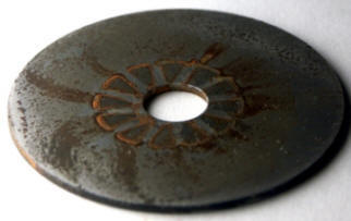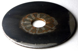 The picture on the right shows the largest washer (3.8 cm diameter) used in these experiments after one month in the 3% NaCl solution with normal aeration an no agitation. After brushing off the top side of the carbon steel washer to remove loose corrosion products we could see general pitting corrosion attack everywhere except near the Teflon of the MCA that was pressed on the steel, where the attack seemed to be more localized.