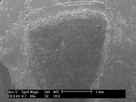 A close-up view with a scanning electron microscope revealed the shallow groove made by the corrosion attack of the steel while the area underneath the Teflon material and further away from the MCA still had the striations marks made before exposure by the final steel wool polish.