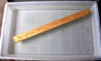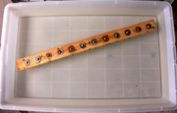 | First, the torture bench. Nothing complicated, but my GOD, so powerful: simple tap water and a porous medium. The piece wood you see floating here has already had been drilled to receive twelve sacrificial lambs that will be offered to the corrosion Devil so he will not come to haunt us and lure us to the scrap yards of the world. |