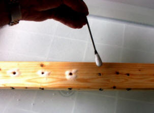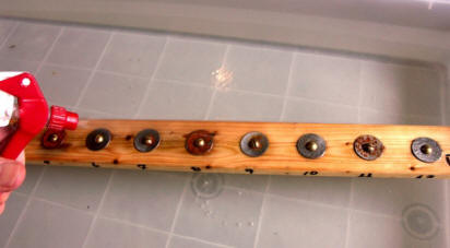 | Here is how it looks after having assembled pretreated washers, bolts and nuts unto the presoaked wooden board. As you can see we have numbered each of the sample site for future reference. In this particular test, we have tried nine commercial CPCs, two bare steel washers and one galvanized . The picture you see here was taken after two days of testing. Can you already see some serious differences between some of the test coupons? |