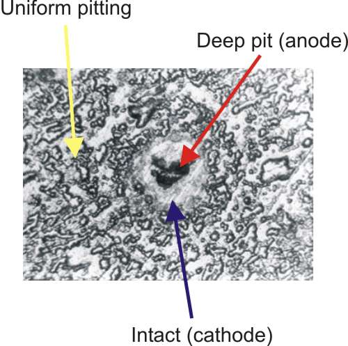 This example of a pitted surface was produced by exposing a specimen of aluminum A92519 to 3.5% NaCl during seven days. The width of the picture is approximately 1 mm.