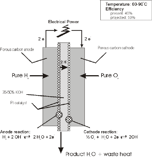Oxygen reduction kinetics at ambient temperature is more rapid in alkaline electrolytes than in acid electrolytes, and the use of non-noble electrocatalysts, in the same conditions, is feasible. However, a major disadvantage of AFCs is that alkaline electrolytes, such as NaOH or KOH, react with CO2 to precipitate carbonates. The main consequence of that side reaction is that AFCs are currently restricted to specialized applications where pure H2 and O2 are utilized. AFCs have therefore been considered appropriate for small power aerospace and defense applications, but their use in commercial applications has so far been limited. A schematic description of the components in an AFC is shown here: