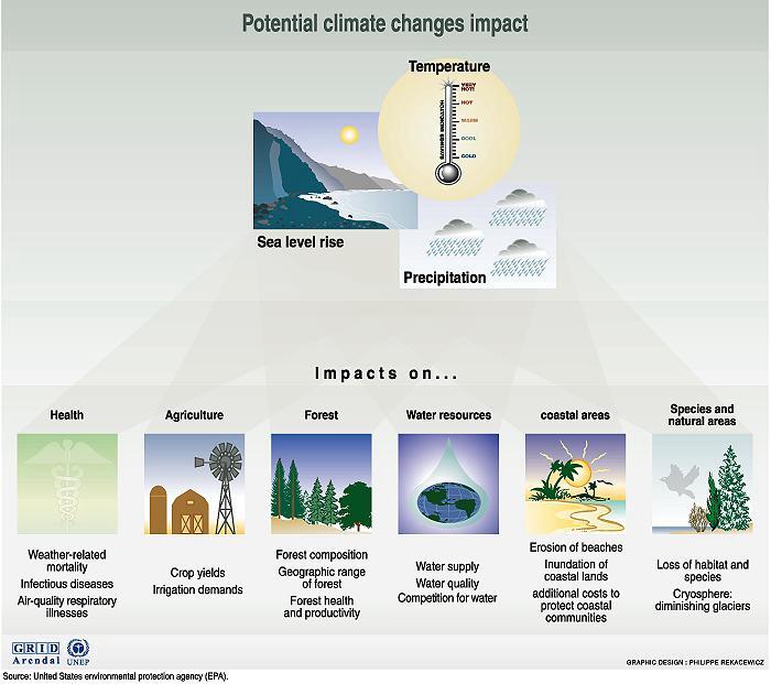 Humanity's greenhouse gas emissions are expected to lead to climatic changes in the 21st century and beyond. These changes will potentially have wide-ranging effects on the natural environment as well as on human societies and economies. Scientists have made estimates of the potential direct impacts on various socio-economic sectors, but in reality the full consequences would be more complicated because impacts on one sector can also affect other sectors indirectly. To assess potential impacts, it is necessary to estimate the extent and magnitude of climate change, especially at the national and local levels. Although much progress has been made in understanding the climate system and climate change, projections of climate change and its impacts still contain many uncertainties, particularly at the regional and local levels. (reference)