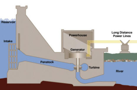 | Hydraulic power systems include both hydroelectric and pumped storage hydroelectric plants. In both processes, water is directed from a dam through a series of tapering pipes to rotate turbines and create electricity. In principle, the potential energy held in the dam converts into kinetic energy when it flows through the pipes.(reference) (drawing courtesy) |