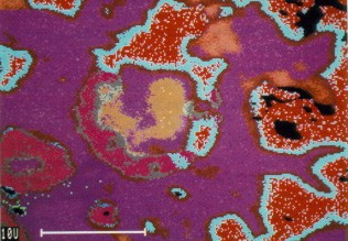Many blended or dispersed phase high Cu amalgams show excellent clinical performance in long term clinical trials. However, little is known concerning the microstructural changes that occur during clinical use of these systems. The picture on the right shows the in vivo corrosion attack with red and aqua products that penetrate the amalgam withcompositional changes in alloy particles and matrix indicated in shades of purple. (photo courtesy)