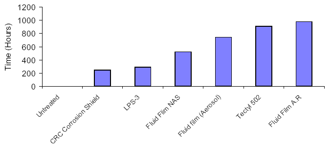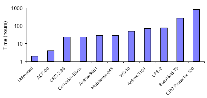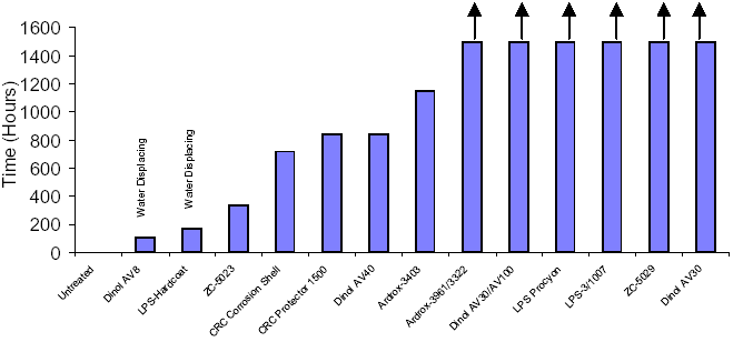 The Times to Failure (TTF) for various CPCs are shown in Figures II-IV. Most of the WDSF CPCs provided protection for periods of less than 100 hours. The notable exceptions were Boeshield T-9 (270 hours) and CRC Protector 100 (840+ hours) (Figure II). These two products have a waxy consistency when dry compared to the other products which have an oily texture. (reference)
