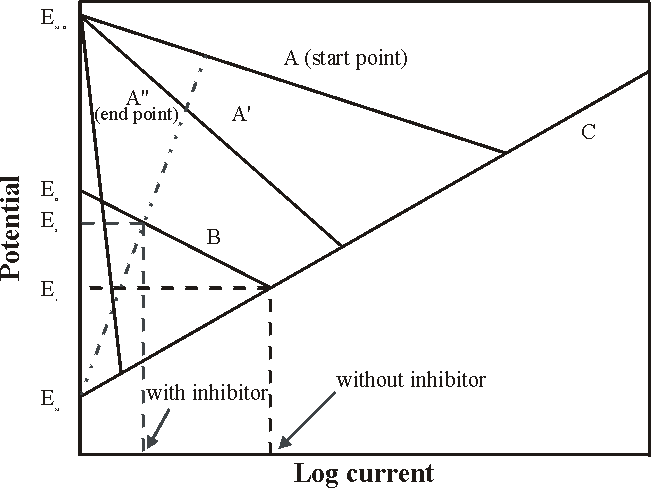 Diagram showing the effect of an anodic inhibitor on the dissolution rate of iron and iron oxide