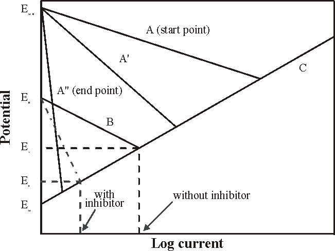 Diagram showing the effect of a cathodic inhibitor on the dissolution rate of iron and iron oxide