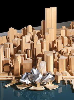 | Its slithering, unfolding mass of glass, concrete and titanium, based on Gehry's highly acclaimed Bilbao Guggenheim in Spain, will sit on the East River, alongside the Financial District. But unlike Bilbao's curvaceous silhouette , the new building's baroque twists are as much sculpture as actual structure. Wrapped within this multitude of what looks like confusion lies a fairly traditional skyscraper, which Gehry has given a wrenching twist. This inner skyscraper reflects Gehry's vision of tying the new Guggenheim to the buildings around it. The tower is slated for luxury condominiums that will be sold or leased at a premium to corporate donors and wealthy patrons. An ice skating rink and a restaurant will sit underneath the structure. However, its implied audience is not the citizen, but the corporate, cosmopolitan elite. Whatever you may think of this, you have to give credit to Gehry, his museum wrapped around a skyscraper is the perfect embodiment of the New World order for art. |