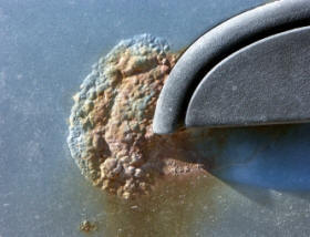 | This particular type of corrosion can be quite damaging since it combines all the elements of a crevice corrosion scenario, i.e. small local anode/large external anode, formation of an acidic environment, production of gaseous hydrogen. Paints are not impervious to water penetration. If the initial bond strength is not real good, if the pollutants in the environment are particularly insidious for the type of paint system used, blisters can develop beneath the paint even though there are no discontinuities in the paint. As the blisters grow larger and begin to combine, the net effect can be gross flaking of the paint in large areas. |