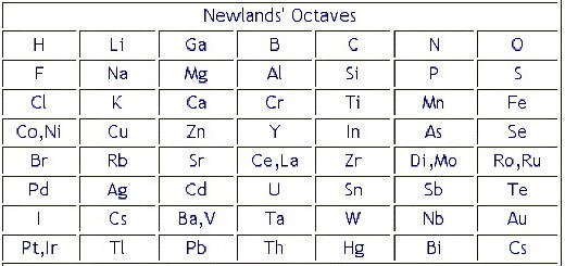Newlands studied at the Royal College of Chemistry and worked as an analytical chemist. Continuing the work of Johann Wolfgang Döbereiner with triads and the work of Jean-Baptiste Dumas families of similar elements, he published in 1865 his 'Law of Octaves', an innovative concept proposing the periodicity of the chemical elements arranged in order of atomic weight. He pointed out that every eighth element in this grouping shared a resemblance and suggested an analogy with the intervals of the musical scale. John Newlands put forward his law of octaves in 1864 in which he arranged all the elements known at the time into a table in order of relative atomic mass. When he did this, he found that each element was similar to the element eight places further on. For example, starting at Li, Be is the second element, B is the third and Na is the eighth element.