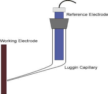 A luggin capillary can be used to bring the potential measuring point in close proximity to a working electrode under investigation. Such a device can be made of any material provided it is inert to the electrolytic environment. It basically consists of a bent tube with a large enough opening to accommodate a reference electrode and a usually much smaller opening only large enough to insure diffusional movement of the electrolyte. The device minimizes any iR drop in the electrolyte associated with the passage of current in an electrochemical cell.