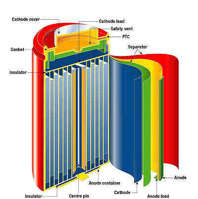 However, they store about 2 to 3 times more energy than a comparable nickel-cadmium battery, display similar room-temperature performance, but perform poorly at low temperatures. The main advantages are good charge retention and a working voltage that can be 2.5 to 3 times that of Ni-Cd cells. Most of the cells manufactured are slightly larger than AA-size (14mm diameter x 50mm height) called 18650 (18mm diameter and 65mm height). These cells are spirally wound and are usually sold as battery packs. Larger format cells ( 67mm diameter x 410mm long) are now being developed for electric vehicle applications.