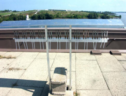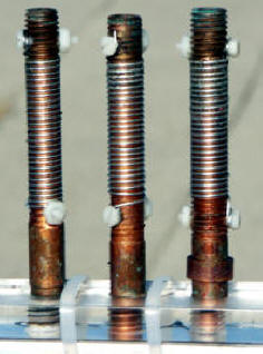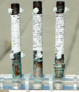 Once cleaned the weight of the aluminum wires of these exposed CLIMATs was measured and compared to the initial weight to provide an estimate of the environmental corrosivity. The corrosion acceleration was quite successful since an average of 15% loss to corrosion was achieved on the non-protected coupons in ten days or 45% per month. In comparison, the most corrosive atmospheric test sites in North America, i.e. Kennedy Space Center corrosion testing facilities, can corrode the aluminum wires at the very fast rate of 30% per month during the most corrosive winter months of the year. Additionally, the coupons coming back from tests at this harshest test site in continental USA look very much like the coupon on the left side of the photos above.