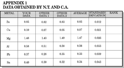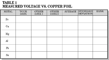 Fill a wide mouth bottle with salt solution. Hang a copper strip over the side of the jar, and stopper the jar. Abrade all metal strips with sandpaper. Clip one lead from a voltmeter to the copper strip and the second lead to a metal strip into the solution through the hole in your stopper and record the voltage on Table 1. Obtain two more sets of readings from other students; average and calculate the standard deviation. Rank your metals in ascending order of voltage.