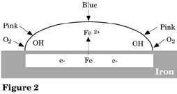 In this experiment we can watch the corrosion reaction by using substances that produce a color change when they react with the products of the iron oxidation or oxygen reduction. Recall that phenolphthalein turns pink in the presence of hydroxide and ferricyanide turns a deep blue in the presence of iron II++ (rust). (see experiment #6, Metcalfe, H. Clark, Modern Chemistry, Holt, Reinhart and Winston, 1982, pp. 147-50.