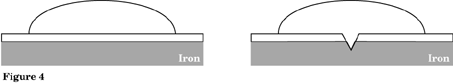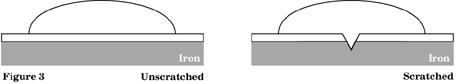 Using the file, place a deep scratch on one area of a polymer coated steel can lid. Place 3 drops of ferricyanide and 4 drops of salt solution on the scratch. On a second area of the polymer coated lid, place the drops as above and cover with a watch glass. Observe both areas of the lid for at least 5 minutes. What changes occur? Record in Figure 3.
