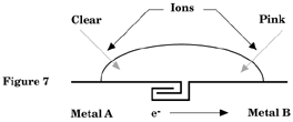 Place 2 strips of metal from Table 2 on each other and fold one end of the strips over each other several times. Flip one metal out so that both metals are visible (see figure 7). Place several drops of your salt solution on the junction of the 2 metals. Observe and record which metal turns pink on Table 2. In using Mg, if both metals turn pink, ignore the Mg.